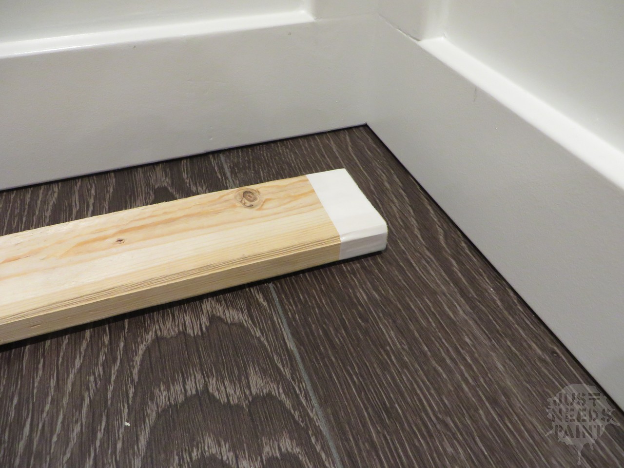Using a really strong construction adhesive we glued the plywood down to the floor. Slide a scrap piece of laminate under the baseboard heater to see if the laminate will fit under it whole. Start by putting the baseboard end of the flooring under the first baseboard at an angle.